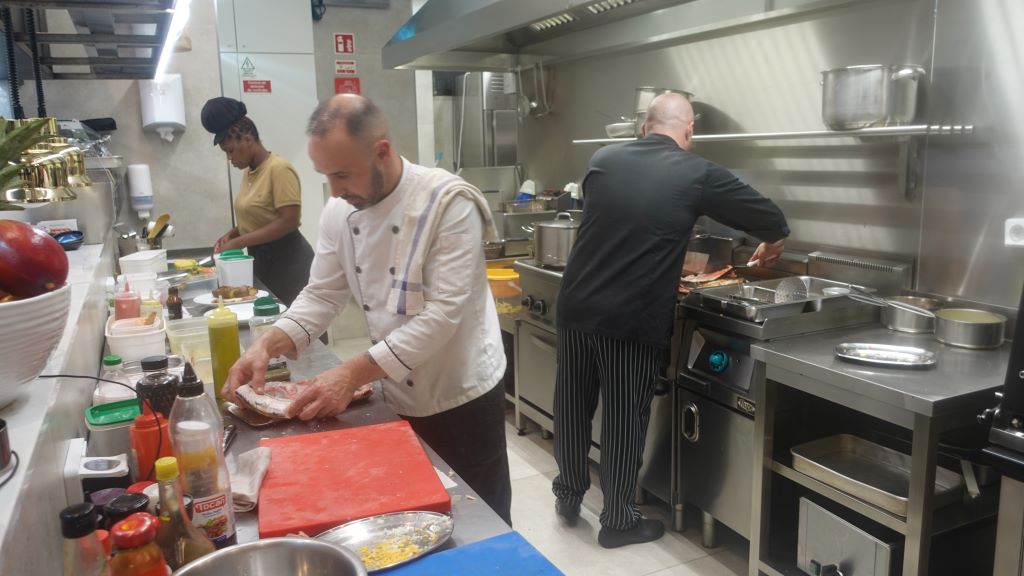 Du kannst die Köche bei ihrer Arbeit beobachten. Fisch ist hier der Schwerpunkt.